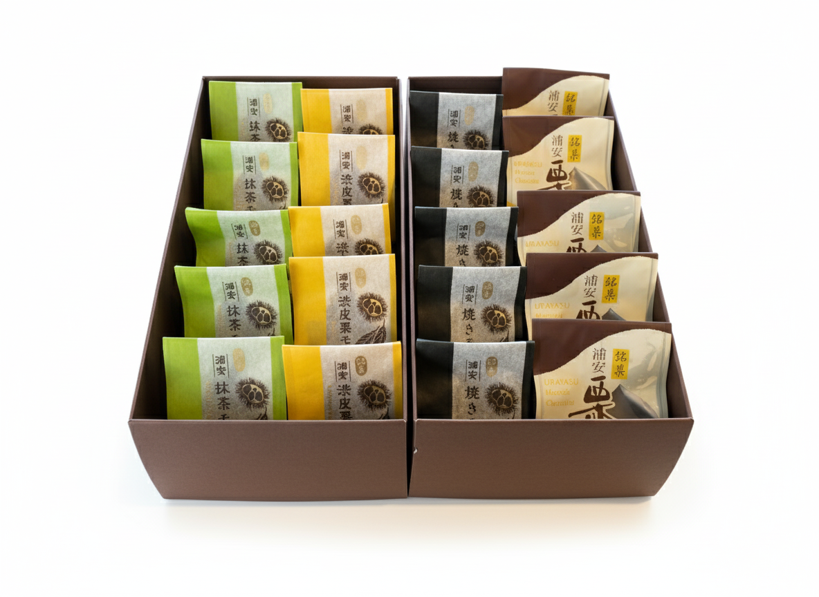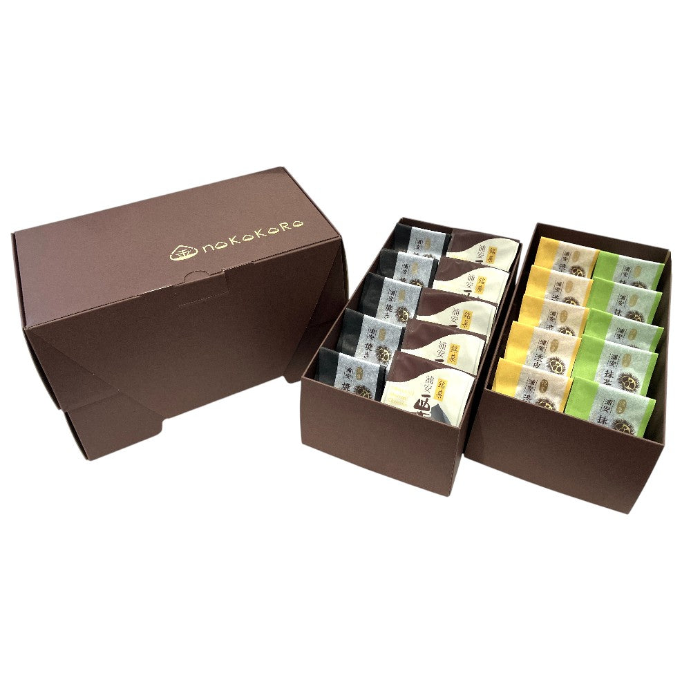 焼きモンブラン20個入セット。焼きモンブラン×5個、渋皮栗モンブラン×5個、抹茶モンブラン×5個、栗ショコラ×5個の詰め合わせです。贈り物に最適です!(価格は箱代込みの金額です)
